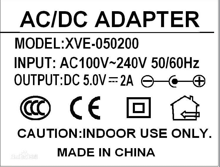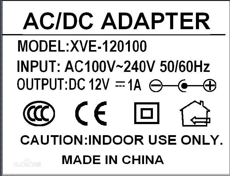如圖所示,在電源適配器(下面稱adapter)的標(biāo)簽上面一般會(huì)有幾項(xiàng)是需要注意的。第一,是adapter的型號(hào),例如這顆adapter的型號(hào)是XVE-120100,它告訴了我們幾個(gè)信息,就是它的廠商、主要參數(shù)等,XVE開頭的一般就是##公司代號(hào),120100就是說明這個(gè)adapter是12W的,050200的就是10W的;第二就是adapter的INPUT(輸入),在中國通用的一般是100-240V~50-60Hz,這說明這個(gè)adapter可以在100V-240V的電壓下面正常工作;第三就是adapter的OUTPUT(輸出),兩個(gè)數(shù)字可以很快速的算出這個(gè)adapter的瓦數(shù),例如這個(gè)adapter,電壓12V*電流1A=12W(功率),說明這個(gè)電源就是12W的adapter。
