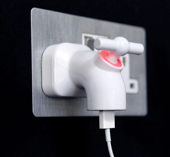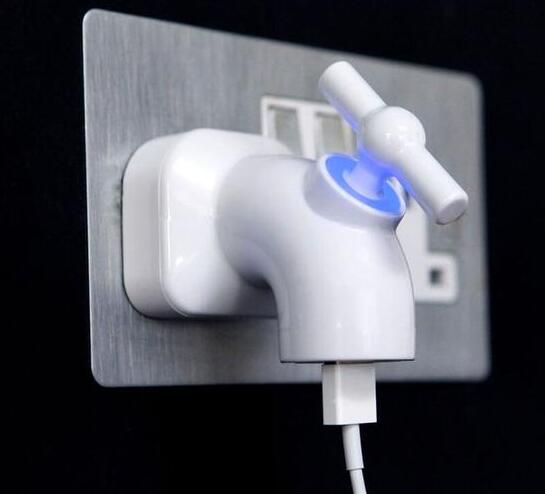 這款充電器在外觀方面居然是一個(gè)水龍頭的造型,看起來(lái)非常奇葩。在水龍頭上,一端為電源插頭,另一端為USB接口。在使用的時(shí)候,將電源插頭插在插座中,然后再把手機(jī)和水龍頭的USB接口連接,然后就可以為手機(jī)或者Pad等數(shù)碼設(shè)備進(jìn)行充電即可。