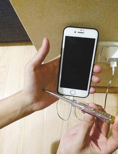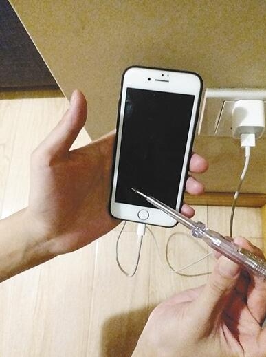 實驗道具:金屬外殼手機幾部、對應(yīng)的充電器、一支家常電筆(用于測試100V~500V交流電)實驗過程:按照網(wǎng)上視頻的方法,記者首先將一部手機充上電,隨后用手握住手機,再用電筆測試,手機機身和手上是否帶電。