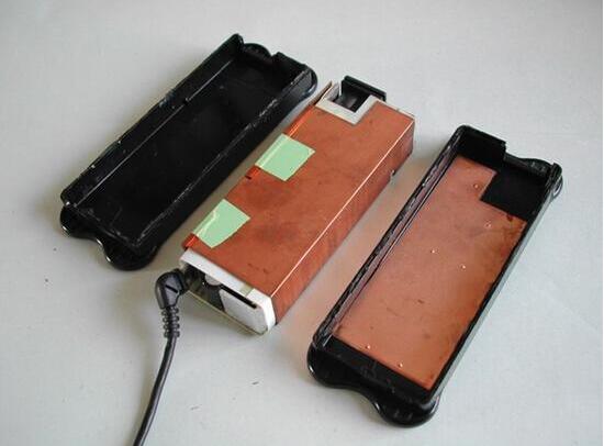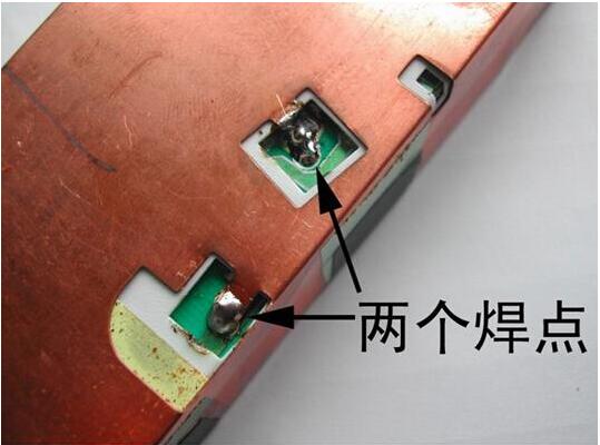 2、打開適配器的外殼,適配器外還包有銅質(zhì)的屏蔽保護(hù)層,用美工刀隔開屏蔽層上的膠帶,再用電烙鐵焊開屏蔽層和電路板鏈接上的兩個焊點(diǎn)(圖3)就可以取下屏蔽保護(hù)層了。