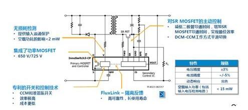 開關電源分為隔離與非隔離兩種形式,對于中小功率的應用,常用的隔離電源拓撲結構有正激式和反激式。反激式指在變壓器原邊功率開關管導通時副邊整流管截止,變壓器儲能。原邊開關管截止時,副邊整流管開始導通,能量釋放到負載,周而復始的開關工作。反激式電源結構簡單,省掉了一個和變壓器體積大小差不多的電感,因此在中小功率電源中得到廣泛的應用。從控制方式來看,InnoSwitch3系列產(chǎn)品初次級之間采用數(shù)字反饋的FluxLink技術進行反饋信息的傳輸,對初次級的開關實現(xiàn)精確的時序控制,可以實現(xiàn)非常高的效率,同時其動態(tài)響應特性極佳,而且輸出紋波很小。其次級檢測輸出電壓電流的控制方式使得該系列產(chǎn)品可以輸出高達65W的輸出功率,如果采用前級的功率因素校正電路,甚至可以輸出100W的輸出功率。