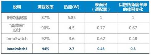 相對于上一代產(chǎn)品,InnoSwitch3系列的轉(zhuǎn)換效率雖然只提高了2%,但是產(chǎn)生的熱能從3.6W降低到2.7W,減少了25%,僅從散熱角度考慮相對于舊款傳統(tǒng)適配器其表面積可以減小52%,意味著可以實現(xiàn)更小更輕適配器的設計。