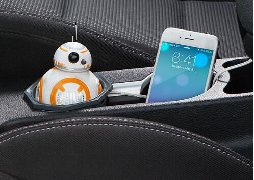 這次所推出的「BB-8」車用充電器的設(shè)計在下半部的地方是采用圓柱體的外觀,剛好能讓駕駛將這個車用充電器安置在飲料杯架的地方,百分之百的符合使用者所需的設(shè)計!值得一提的是,這次所推出「BB-8」造型的車用充電器可以表現(xiàn)出與電影中BB-8所運行方式一樣的情況,上半部半圓形的機體可以左右擺動并且360度旋轉(zhuǎn),更是有兩個USB插槽,有興趣的不要錯過啦。