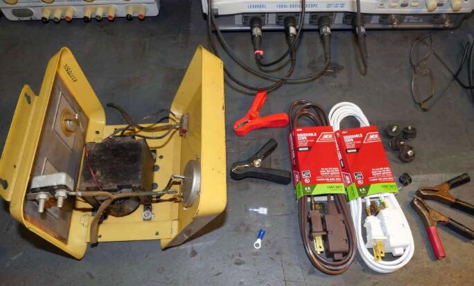 我買了翻新充電器需要的所有材料。我從Home Depot買了兩根6英尺的延長線,這兩根線的顏色必須不同,這樣才能將電池電線和AC線區(qū)分開;電池夾是我很多年前從亞馬遜上買的——其實我早就想做這件事了;我的電盒中還有環(huán)形和鏟形端子;我從Digi-Key買了四個橡膠腳墊和通孔扣。