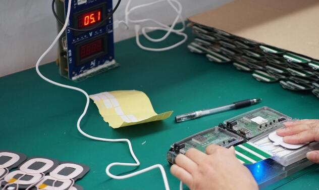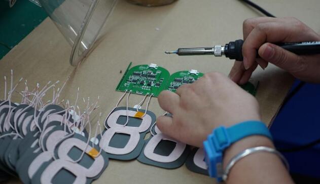 焊接發(fā)射端線圈這個環(huán)節(jié)需要人工操作,從圖上可見技術(shù)員的左手有一個藍(lán)色的手環(huán),這個手環(huán)上有一條線接地,避免人體靜電擊穿高精密芯片。